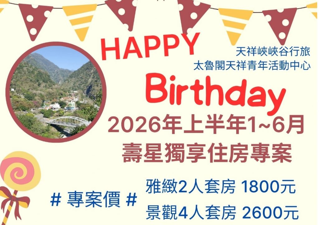 ◎專案日期:~2026.6.30 ◎專案優惠: 想用太魯閣的風光美景慶生嗎? 生日月前往每人只要$650元起 ◎注意事項: ※本中心接待對象,凡參加公益、教育、服務、健康、環境及文化等活動之人員或持有 […]