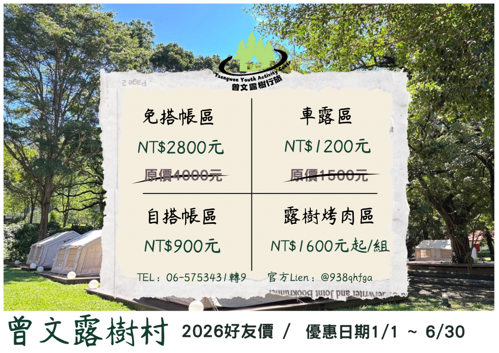 ◎專案日期:~2026.6.30 ◎專案優惠: 全新露營新體驗~體驗價格好划算!! >>>詳細資訊 <<< 請點擊 電話:06-5753431分機9 […]